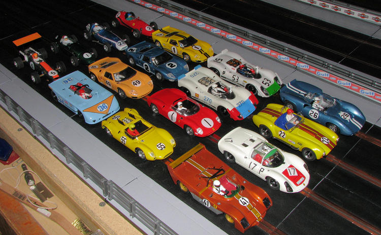 Anyway, I thoroughly enjoy the work that goes into one of the rehabs or repaints. It generally takes several weeks to well over a month to do one from start to finish, but like my lethargic model kit building, doing a little bit at a time will eventually get things done. These don't just sit on the shelf to be admired, but get run quite frequently. If you look at the header image, the blue car, a Cheetah, is a resin kit that provides the body and chassis with everything else coming from somewhere else. The yellow Cobra is a repaint where the body has all the bits removed, is stripped of paint and then redone. The Ferrari is a RTR.
