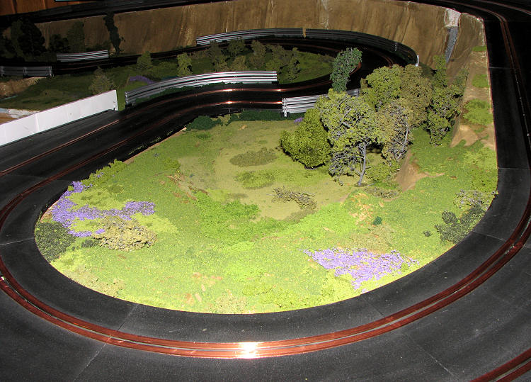 Besides spending quality time playing on the track, not a whole lot has been done. I've added a considerable amount of foliage to the areas earlier prepared with ground material. This is somewhat slow work as building up trees can be time consuming. It also doesn't help if one does these things in fits and starts. I find that I'll do nothing at all for a considerable period of time, then I'll get into the mood to add more stuff and will go great guns for a week or two before letting things lapse back into non-action. This is equally the same when it comes to working on building up new cars.
