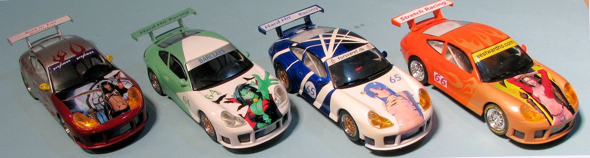 Just in the last several months I have continued with the car repaints for the home track. I mostly go for cars with large flat hoods (bonnets) as they are a more user friendly canvas for the anime artwork I put on them. Some of these are real basket cases with broken bits and missing bits (mostly mirrors and wings, which can be bought as spares though availability is often quite limited). So far I have finished four of them with a few more in the wings. When I do these I basically disassemble the extant bodies, remove the mold seams, primer them and then add the various colors and decals. These are mostly painted with Tamiya and Testors lacquer paints in rattle cans.