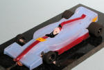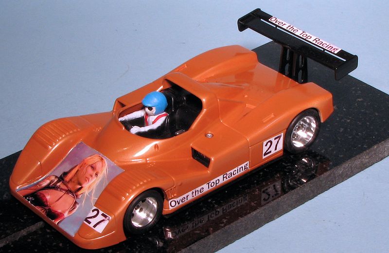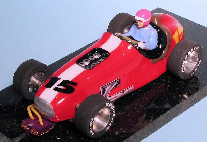 Both of these cars are based on metal chassis as the track is painted particle board (what we all call a 'wood' track). One is a 1/32 Indy car which we ran on the oval course a couple of years ago, and the other is a 1/24 old time sprint car. Both of these cars can be built up from easily available parts and like the majority of wood track cars, have a vacuformed body that is painted on the inside. I should also mention that wood cars run on foam tires that wear out rather quickly while plastic cars generally use silicones.