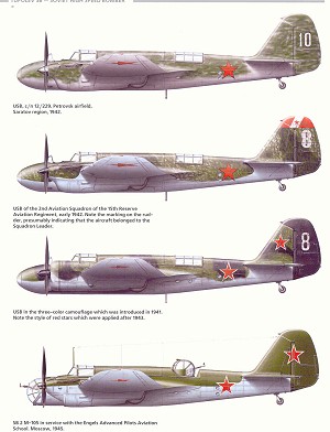 Probably one of the most famous Soviet pre-World War II bombers, the Tupolev SB first appeared during 1934 This aircraft pioneered a number of design features for Soviet aircraft, and was probably one of the most advanced aircraft of its class in the world at the time. Featuring such innovations as all metal construction, retractable landing gear, enclosed cockpits, internal bomb stowage, and controllable pitch propellers, the SB was produced in considerable numbers prior to the outbreak of war in Europe, and although it was the major Soviet light bomber at the beginning of the war, the design was already six years old, and aeronautical developments had rendered it obsolescent by the time it was committed to combat against the Luftwaffe, which was equipped with modern fighters. It did not fare too well against Messerschmitts and Focke Wulfs, although it must be remembered that the majority of these aircraft were destroyed on the ground during the first few days of the German attacks.