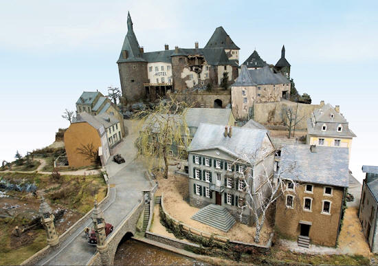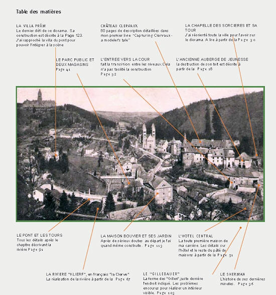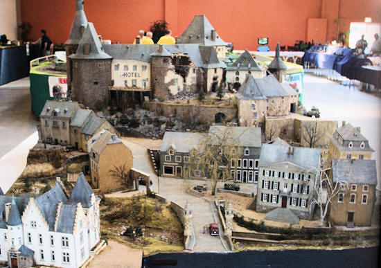 THE PARK AND LOWER VILLAGE .numerous house for domestics and shops, hotel, café, garage... The tips for the trees, the roots are free materials…chairs, letters box (from 1944 designs).publicity posters are real. The GMC truck was undamaged with a tree.