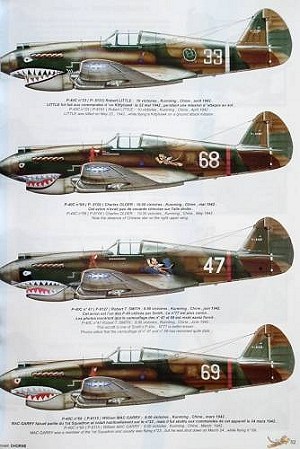 All start with the portray of Claire Lee Chennault, the father of the AVG in China. With a mixture of color and b/w pictures, you’ll discover the beginning of the story with as elsewhere in the world, ground accidents during training courses. Personnel and the AVG ‘s leopard mascot lead you in the daily routine very well. The camouflage and markings chapter is an adaptation of Terrill’s Clement research for Aeromaster decals, dealing with basic camo, spinner and wheels areas, stencils and serials, nationality marks, shark teeth, insignias, victory marks, weathering effects, inside cockpits… aside 12 color profiles and a upper view drawing. The following P-40 chapter (3) in 12 pages give a comparison chart between P-40 C/E versus KI-27 KI-43 KI-44 and KI-45 ennemies. A listing on 2 pages inform us on Curtiss serial, AVG serial, serviceable date, individual figure, pilot name for 99 P-40C in service. The color photoscope with its 45 details pics cover the general airframe views, canopy, cockpit, gears, and engine (cowlings removed). As machines are nothing without men, they are honoured through aces in the chapter about victories and losses. Ace status start with 5 victories and each of the 19 flying tigers that reached this are shown with a pilot identity picture, short story of the career, details on enemies shot down and a profile of they aircraft! Four more pilots, even if not considered as aces are not forgotten due to their personality; Greg Boyington, James H.Howard, Kenneth O.Jernstedt, Robert.L Scott.
