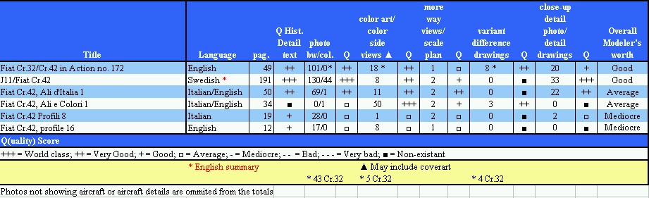Cons: contains no history besides the comments on the side views and has no detail information. Should be bought with its older brother by the same publisher, because together these two books are the best that is available on the Cr.42. Alone both fall short off the more all-round Squadron/Signal title.