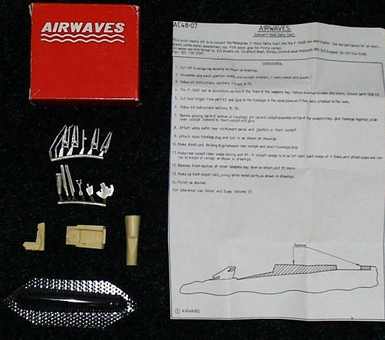 This conversion includes most of the pieces necessary to convert Monograms F-106A single seat interceptor into an F-106B two seat trainer. It includes a nicely done vacu-form canopy, a resin cockpit tub, ejector seat, and refueling hump for the spine, and a rear instrument panel, throttle quadrant, control yoke, missile bay rail assemblies, and radar scope, all cast in white metal.