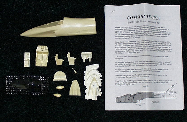 C&H Aero Miniatures has filled a gap for modeler’s interested in jet aircraft by releasing a 48th scale conversion for either release of Monogram's F-102A kit into a TF-102. I obtained my copy via the Internet by placing a winning bid for it on ebay. It has also been featured in a recent issue of FSM magazine, but no way of contacting C&H is provided. I paid $50 for the conversion, which is what the list price in FSM was.