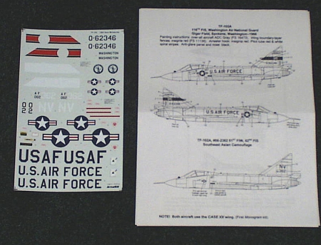 The decals provide appear to be of high quality, akin to Superscale or Experts Choice. Markings are provide for a 116th FIS Washington ANG a/c in the standard ADC gray, and for a 62nd FIS a/c in the Southeast Asian scheme. A painting diagram for the SEA scheme is also provided. Other aftermarket decals could easily be substituted for those provided, and the conversions used to do a single seater.
