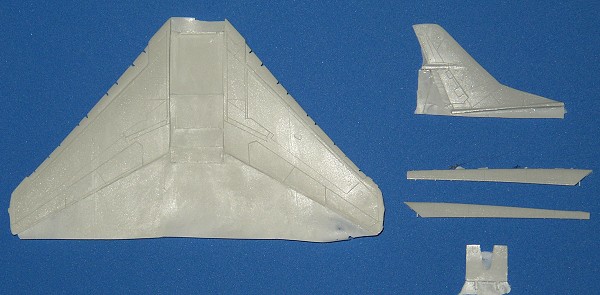Since most of the parts are direct replacements for the kit parts, the instructions are pretty brief. The only tricky part of this conversion for a new modeler would be cutting the D tail off of the kit. Otherwise, its pretty straight forward. The resin is well cast, but there is a slight "eggshell" texture to the parts. Sanding with fine grade wet/dry sandpaper is in order here, especially if you plan on doing a bare metal Hun. One of my sets also has a little warpage on the wingtip, but this is nothing that running under hot water, and tweaking can't fix. The only slight drawback I can see to this set is that there are no holes for weapons pylons. If you want to add them, you'll have to do so very carefully in order to get them in the right spot. There is a hole on the underside of the wing provided for the refueling probe. I haven't done any test fitting of parts yet, but eyeballing it reveals that there shouldn't be too many fit issues.