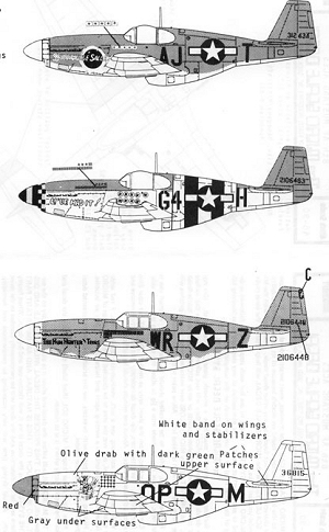 A/C #2: P-51B “U’ve had it!”, Pilot: Maj John B. England, 357th FG / 362nd FS. Natural Metal with upper surfaces painted over with Olive Drab. Full invasion stripes. Standard 357th FG red / yellow checkerboard nose & yellow/red spinner.