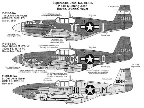 Aircraft represented are William Hovde’s “Ole II” from the 355th FG, Gilbert Obrein’s “Shanty Irish” from the 357th FG, and John C. Meyer’s “Lambie II” from the 352nd FG ( A wonderful choice for those who are tired of “Petie 2nd” Markings, yet still wish model a Meyer Mustang ).