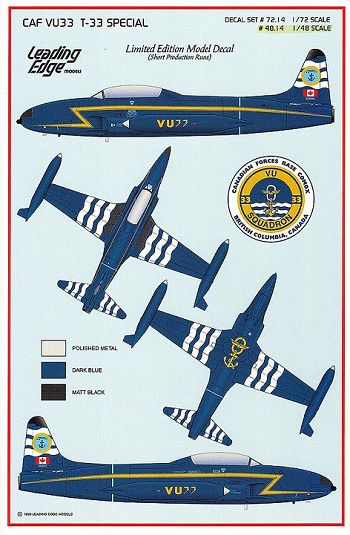 VU- 33’s Special is overall Dark Blue, with Blue and White wavy invasion stripes on the wings, vertical and horizontal stabilizers. The squadron emblem consisting of an winged anchor is on the tail fin, and a gold winged anchor is placed under the fuselage. To top off the scheme there is a gold cheatline for the fuselage and some VU-33 script for the wing tanks. Leading Edge provides all the marking needed for the aircraft, including additional intakes and exhaust ports necessary for the re-engined CAF CT-133.