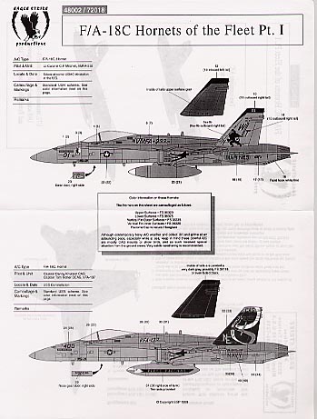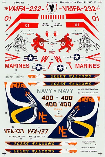 Also on the sheet are markings for VFA-137 the Kestrel’s CAG bird. Since the design encompasses the entire tail, decals for the Hasegawa and Monogram kit are included. I can’t comment much on this bird because I’m prejudicial toward Marine jets and against designs that look like flying buttcheeks. Nevertheless, since the original had a hand-painted portion added to the color stencils, the two sides of the tail are not identical. The sheet reflects this.