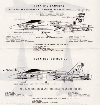 A few words about the Hornets depicted on these sheets. As said, these jets were early F/A-18C’s. If you are going to use the Hasegawa kit, fill in doors 5L and 5R. Sand off the antennas behind the intakes. Omit the braces inside the tail fins. The rest can be built straight out of box. If you are going to use the Revell-Monogram kit, fill-in the square screens on the spine behind the canopy, and also the vents on the inboard and outboard surfaces in the "forward corner" of both fins. Sand a ¼ inch of the Sparrow fairings flush on the forward end. These features were found on the prototype, not production Hornets. The rest can be built straight out of box.