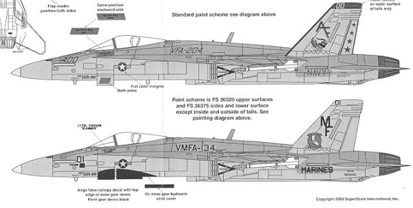 (Actually, the instructions show F-18Cs so use them only for decal placement, a good rule of thumb for ANY decal instruction sheet. Ed)Since I was a radio repairman in MAG-46, I really like this sheet and I’m glad that Superscale produced it. VMFA-134 had also inherited some tan and brown camouflaged F/A-18As previously owned by VFC-13. Maybe a certain Marine aviation ordinanceman will produce decals for these jets. Until then, I’ll need to build another F/A-18A to apply these markings that are nostalgic (for me).