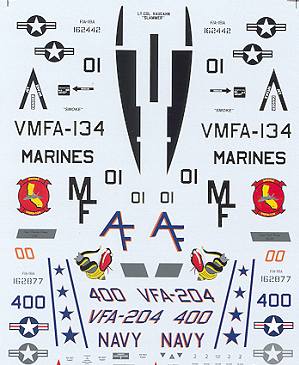 The sheet has two colorful Hornets from two Reserve Squadrons, the CO’s jet from VMFA-134 and the CAG birds from VFA-204. Well, maybe “colorful” isn’t entirely accurate term, but they’re not the run-of-the-mill gray.