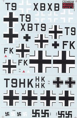 This decal sheet from Cutting Edge contains markings for a Mosquito B. Mk.IV, P-47D-2RA, and P-51B Mustang. The first two are fully repainted in RLM74 upper camouflage, with lower surfaces in RLM04 yellow, while the P-51B is in natural metal upper surfaces and RLM04 lower surfaces. All three are in German markings.