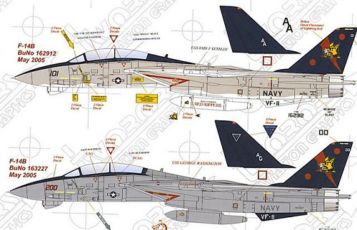 First is the CO’s aircraft in a one-off, retro gull gray over white retirement scheme to commemorate the last F-14 operated buy the unit. It’s interesting to note that VF-11’s F-14s never were in the gull over white scheme. They transitioned from overall gull gray F-4Js to overall gull gray F-14As starting in 1980. The supplied walkway & “NO STEP/PUSH/LIFT” decals are for this aircraft, as well as the red stripe that goes completely around the top & bottom of the aft fuselage. As this was a one-off type paint scheme, the grey/white color demarcation lines are not standard when compared to a similarly painted F-14, & there is a small, easily corrected difference between the sheet painting diagram & the way the aircraft was actually painted. The main landing gear doors are all painted white, but the fuselage directly behind the aft most doors is gull grey. As a picture is worth a thousand words, here are some links to photographs of the undersurface of the aircraft: