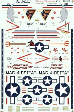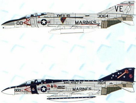 The other a/c on this sheet is the specially marked F-4S from VMFA-321 “Hells Angles”, a reserve unit in the Washington D.C.area. This was a retirement scheme worn on one of the units’ a/c, prior to converting to an F/A-18 unit in the very early 90s. This unit was the next to last F-4 unit in the Marine Corps. The aircraft was repainted in the gloss gull gray over white scheme, with the tail, spine, canopies, anti-glare panel, & upper radome in gloss insignia blue. The upper surfaces of the flaps & aileron were gull gray, not gloss white, as you would expect in this scheme. There are 50 individual white star decals that need to be applied to the gloss blue areas. The thin blue stripes with the small white stars on the edge of the decal sheet are the stripes for the sides of the 600-gallon centerline fuel tank.