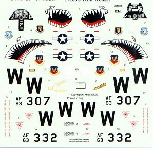 Both a/c are from the same wing, and very small differences do exist between these two a/c. A/c # 332 used the wing badge with the dark blue background with the yellow glove, while a/c # 307 uses the badge decal with the light blue background & white glove. The tail code on 307 is slightly larger & wider than on 332. Of course, the most obvious difference is the different style sharks (weasels?) mouth on each a/c.