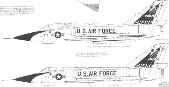 This sheet offers markings for a single seat F-106A, & a dual seat F-106B of Detachment 15, Air Force System Command, whose mission was to fly chase aircraft duties for the B-1Bs right off the assembly line.