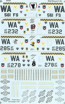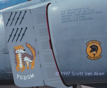 The second a/c carries a "Wild Weasel" character with the infamous “YGBSM” acronym on the splitter plate, along with 8 HARM launch markings. Also, the squadron badge is incorporated into the black & yellow checkered tail band.