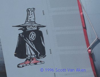 The third a/c carries a "Super Wild Weasel” character on its splitter plate, along with 4 HARM launch markings. This tail band has no squadron badge in it, but it is on the intake.