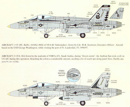 The second a/c is an A model from VMFA-451 Warlords during Desert Storm. The fin flash & fuselage band have been carried over from its days as an F-4 unit. The squadron markings are in gray this time, with a false canopy painted under the nose, which consists of a 7-piece decal The instructions say that there were very little stenciling visible from the bleaching effect of the desert sun.
