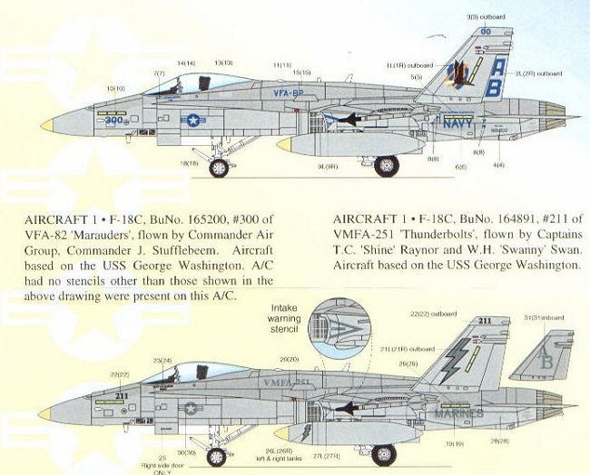 The second a/c is from VMFA-251 "Thunderbolts", while they were part of the air wing. What immediately got my attention about this a/c were the tail codes, modex’es & squadron identifier. All were printed in what appears to be New Times Roman, an distinctive departure from the common block lettering. Four little gray thunderbolts are provided to mark the external fuel tanks. All other markings are gray (modex’es excluded), including all four national insignia.
