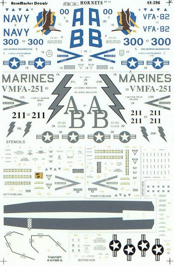 If you like this sheet, & plan to do several F/A-18’s, pick up Aeromaster sheet # 48-394 also. It has the markings for VFA-86 "Sidewinders", the other Hornet squadron from CVW-1. Look for the review here soon.
