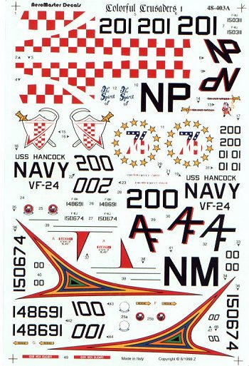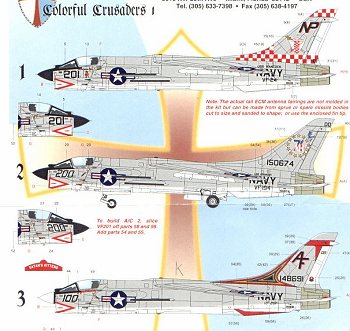 This is the first sheet in the 4 sheet (so far) Colorful Crusader series. The instruction sheet is in full color, & the decals are on two sheets. All three aircraft are in the gloss gull gray over white scheme all the fighter versions wore during their service life. Enough common markings are provided to do 2 aircraft. The left fuselage national insignia is a 4 piece decal, since it goes over the refuel probe door, with a top & bottom, split along the door opening, & two red stripes. The other national insignia are 3 piece decals. Four ejection seat triangles are provided, along with 2 different styles of intake warning triangles (one style incorporates a red stripe for the intake lip). No maintenance stenciling is provided, nor do the instruction show any, so check your references