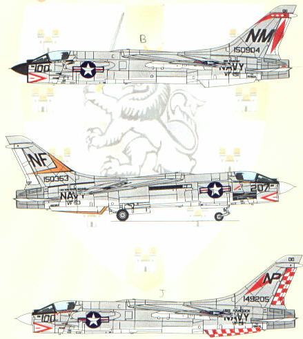 The final a/c from this sheet is a J model from VF-211 “Fighting Checkmates/Checkertails”, also circa 1970. This unit had the most air-to-air kills of all the F-8 units, with 7 Mig kills to its credit. The tail markings consist of three decals per side. The largest of the three is the rudder decal that has the red squares & the upper end of the check mark (#’s 45 & 46). The lower end of the check marks (#’s 40 & 41) is shaped to allow the black NP tail code to go over this area without any bleed through. This a/c has its gun muzzles painted red.