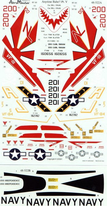 The universally recognized Jolly Rogers are up first. The modeler will have to paint the vertical tails, ventral fins, canopy & windshield frames black. The black canopy hood is provided as a 2 piece decal (front & back), with another decal for the canopy sill. Moving to the tail, the tips of the vertical tail need to be painted yellow, but there is a decal for the yellow trim on the ventral fins. The instructions indicate that the ventral fins were painted black on both sides, but check your reference photos. In the photo’s I’ve seen, the inside of the fins were the same color as the bottom surfaces of the aircraft. White decals do not show up well, but they are there. The skull & crossbones are located over the AJ tail code. Aeromaster provided a white underlay for the tail codes, but not for any of the other decals for the tail. The crew names for the canopy rails are in white, & 4 decals for each name is provided to ensure adequate opacity, although they are bogus names.