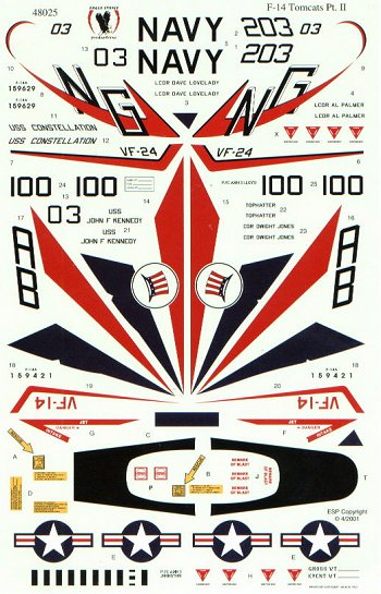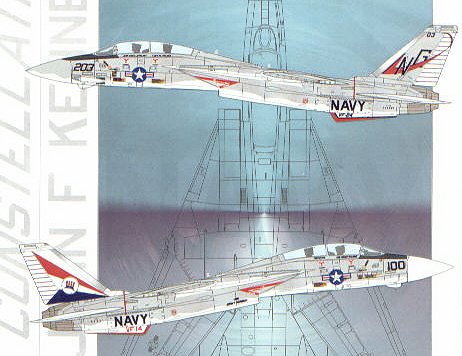 The second aircraft is the bicentennial CAG bird from VF-14 "Tophatters", the navy’s oldest, continuously active squadron (although not always in fighters) dating back to 1919. This aircraft is in the gull gray over white scheme with the wavy demarcation line also. The normally dark red fin flash is now red, white & blue with a starred & striped top hat on a white disc. Both the inside and outside of the vertical tail surfaces, plus the speed bump at the base, have to be painted white. A fin flash goes on both the inside & outside of the tail, with the AB tail code on the inside rudder surface. The blue area of the fin flashes that go on the right side of each tail are designed to go over the actuator fairing, having extra blue material, showing smart planning on Eagles Strikes part. Moving up front, the radome is all white, & "Tophatter" is painted on the rear canopy sills, with the CAGs name on the forward canopy sill. The squared of anti-glare shield is used on this aircraft.