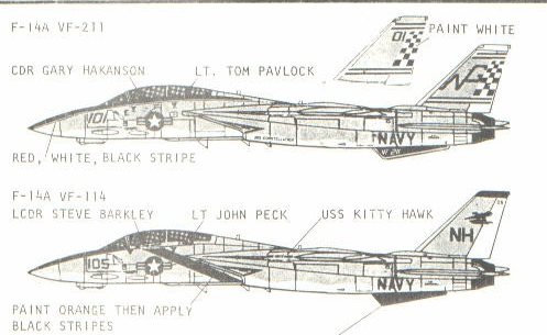 The second a/c is from VF-114 "Aardvarks". Their markings hardly changed when they transitioned over from the F-4J. The decals depict the markings carried during the ‘varks first cruise with the F-14 in 1977. The marking consist of a orange aardvark standing on a black shadow on the tail, with broad fuselage stripe in the same orange, trimmed with black. The fin caps, wing tips, & ventral fins all get the same orange trimmed with black treatment. The modeler must paint these areas orange, and then apply the thin black decal stripes. No F.S. number is given for the orange color.
