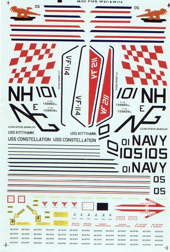 In its early days in the fleet, Tomcats carried a lot of color, & this sheet is representative of that time period. Both a/c are in the gloss gull gray over white scheme, with the wavy gray/white demarcation line, full color markings, natural metal leading edges, & black and white tail hooks. There is only enough common data to do one of the aircraft, & no national insignia is provided, though the instruction sheet tells you what size to use. The stenciling can be read on some of the decals, but the smaller writing is unintelligible.