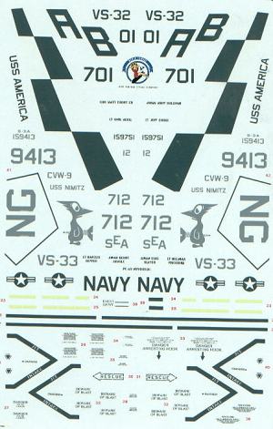 Covered first an S-3A from VS-33 “World Famous & Internationally Traveled Screwbirds”. This a/c is overall FS 36375 light ghost gray, with a FS 35320 dark ghost gray anti-glare shield. The bare minimum of medium gray squadron markings are provided for this a/c. All the other common markings must come from other sources.