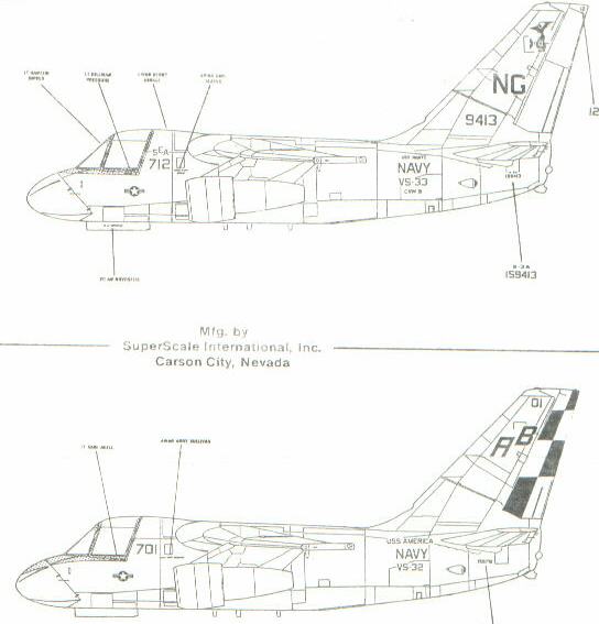 The instruction sheet is the typical Super Scale offering of black & white line drawings. Three left side profile drawings are provided for decal placement (two squadron & one common data placement). There is one smaller drawing of the right side of the nose on the VS-33 a/c to placement of a unique squadron badge. Most of the smaller maintenance stenciling data is readable. Only one set of national insignia, common marking, & formation light decals are provided.