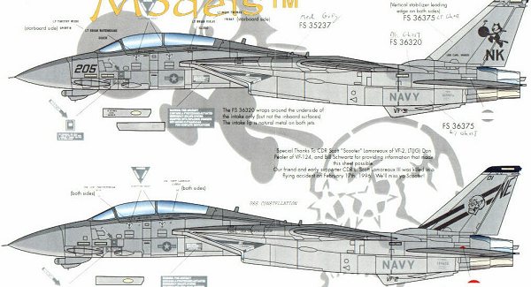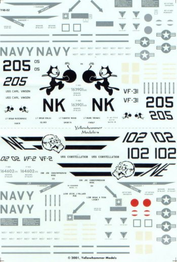 The first offering is from VF-31 "Tomcatters", the second oldest fighter squadron in the navy, having flown bi-planes in the 1920’s. This squadron holds the distinction of being the only one to score aerial victories in WW2, Korea, & Viet Nam. The decals represent normal squadron markings from 1994, consisting of a large Felix figure, air wing code, & carrier name on the tail, as compared to the more familiar CAG markings of the Felix on a yellow disc on a black tail. Four small Felix figures are provided for the drop tanks. There are 4 different names on the canopy rails, with one amusing LT Tim Wood, call sign "Sport’n". All other markings are standard for the type.