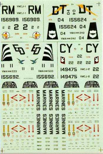 The first decals are for a EA-6A of VMCJ-1 156989/ RM02. The radome is Off-White and dive brakes are Dark Grey. The design on the rudder a yellow hawk on a yellow lighting bolt over a red number one in a white circle.
