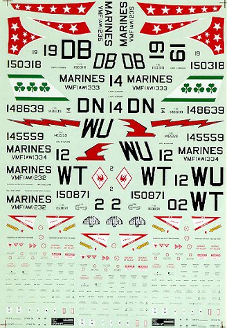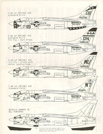 The third decal is a F-8C of VMF(AW)-334 *Falcons* 145559/WU12. There is a decal for *Maj. McMahon*. The fin tip is black with white leading edges. There is a red falcon on the tail with a black outline. The ventral fin also has a red lighting bolt with a black outline on it.