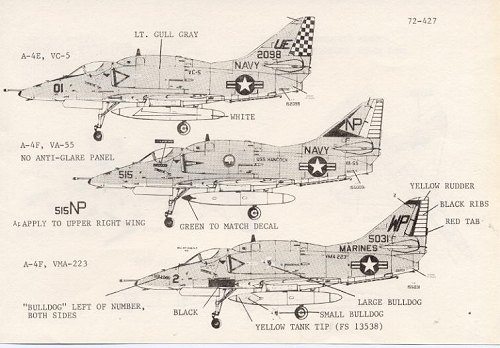 The last one is an A-4F of VMA-223 Bulldogs, 155031 WP2. This aircraft has a black nose and anti-glare panel. The intake warnings are the large ones. The word Bulldog in red lettering is to be placed in front of the aircraft black 2 shaded in yellow to the right, Bulldog is to be placed on both sides. This aircraft is flown by the XO Maj. WP Arnold, stenciled on the right side only in black. The area forward of the guns need to be painted black. There is a large Bulldog, unit logo in the center of the fuselage. There is a small 2 to be placed in front of the rudder. The rudder is yellow with black raised ribs, outlined in red with a red tab. The fuel tank tip is painted yellow with a small Bulldog.