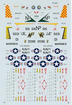 There are enough insignia’s for all three aircraft are included. There are also enough stencils for all three schemes, plus some extra intake warnings. There are no decals for the anti-glare panels like their new sheets. When the all schemes are done you will have a two red JE’s and arrows left over, why I don’t know, extras from when they did VC-2 aircraft on 72-170 decal sheet.
