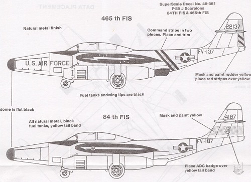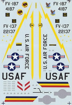 This particular decal sheet has markings for two F-89J aircraft. There are enough common markings and stencils to do one of the two aircraft. Also included are two natural metal surrounds for the insignia of one of the subjects.