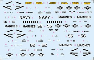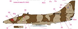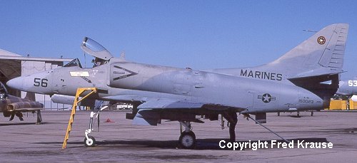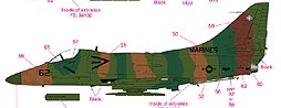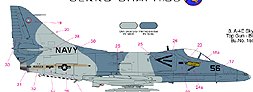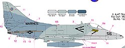 This set of markings covers #56 in the 1983/84 time frame. This scheme uses a progression of four grays. TopGun A-4E #52 also used a similar scheme about the same time frame, but it had a false canopy, which #56 does not. (Editor's Note: This is one of the many 'Heater-Ferris' schemes the Navy experimented with. It is more of a 'splinter' scheme than any of the others.)