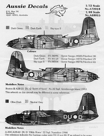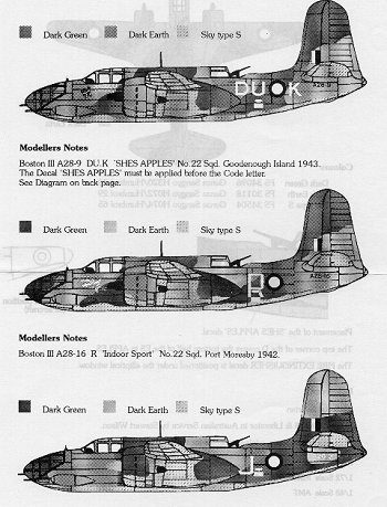 Having accumulated quite a nice little stack of these kits I am always on the lookout for interesting markings. These RAAF sheets from Aussie decals certainly qualify--as the Boston III (A-20C) equipped 22nd Squadron were one of the first to use the A-20 in the six-gun straffer nose configuration that was later to become the factory standard on the A-20G’s. These “gunship” machines were to find fame with both Australian and U.S. units in the South Pacific, though most remember the B-25 Mitchell in this roll…