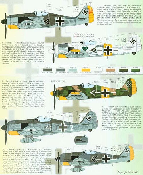 It was the unusual JG54 scheme that caught my eye (though the winter JG54 bird was also quite pretty) but when I opened the packet for a closer look the scheme that sealed the deal was the one for Gallands A-6. I'm a sucker for anything he flew. So that was at least three I was going to have to do from this sheet so I had to have it! Anyway, on with the details:
