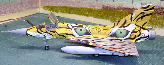 After the beautiful Mirage IV decal, Sylvain Hautier bent on a new challenge with this bright subject. The aircraft appeared at the Tiger Meet session at Cambrai from 2 to 8 June 2003. Unfortunately, the painted aircraft coded 12-YL n°83 was grounded on 5 June at 12 o’clock for engine trouble, and couldn't be shown in flight during the WE meeting. But I was lucky enough to shot it, returning from this mission on final. The subject was different this time, with the tiger skin made of white, yellow, black for the fuselage, while the upper wing surface were silver painted, with fine black strips. The original touches were 2 big airbrushed green eyes on the fuselage and each flag of the NATO countries painted on the leading edge flaps. The decal is complete, with a clear color instruction sheet which give figures to put decals at the right place, and areas to pre paint in different orange-yellow scheme. The eyes are beautifully designed and printed, as you could see on a finished 1/48 Esci/Italeri model. Nothing to tell more, it’s a MUST for a Mirage 2000 lover, for a non conventional livery. The sheet exist also for 1/72 model. Recommended.