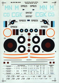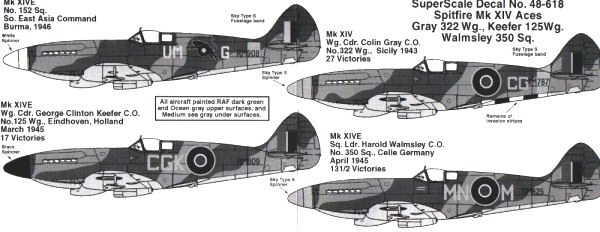 This sheet offers four examples of the Griffon-engined Spitfire XIV, all being high-backed versions in dark green and ocean grey. First is the well-known Mk XIVe UM-G of 152 Sqn in Burma, with the South-East Asia Command (SEAC) all-blue roundels and a leaping panther design on the fuselage.