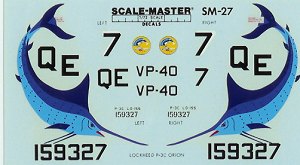 The decal sheet is designed to be used with the only 1/72 Orion kit, from Hasegawa. Aircraft 159327 is a high-viz example with a striking marlin logo on the tail. QE/7 uses the white, light gull gray base and requires the Hasegawa decal sheet to completely replicate the markings on the real thing, including the "stars and bars."