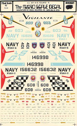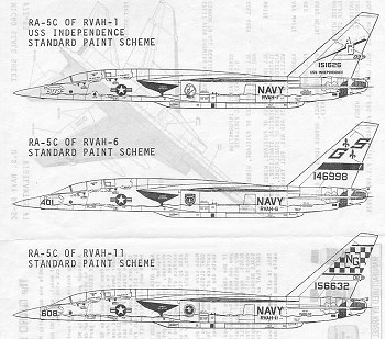 The last aircraft shown is NG-608, for RVAH-11. The unit flew Vigilantes from July 1966 to June 1975, and again, no carrier name is listed. This unit's marks are found in older Minicraft/Hasegawa kits with marks for the USS Ranger.